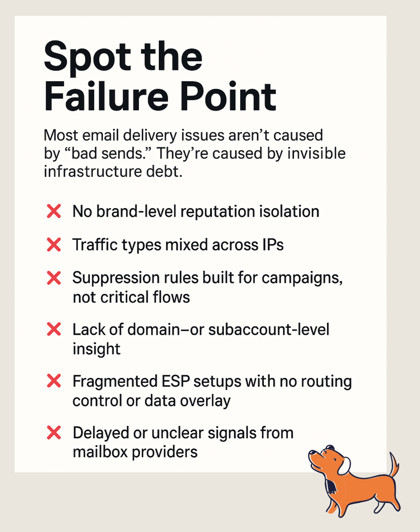 Here’s a quick cheat sheet that digs into where common infrastructure gaps live — and how misconfigurations (like misrouted traffic or weak domain isolation) can quietly tank your inbox placement… even when your content’s great and your lists are clean.